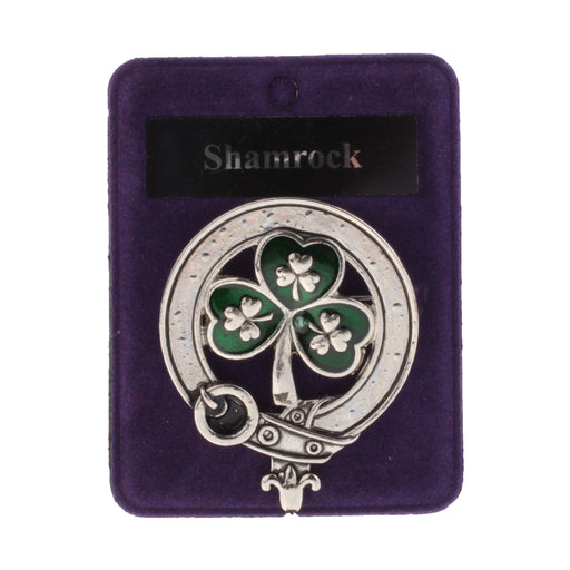 Clans Of ScotlandModel: A05127_SHAMROCK Scottish Clan Crested Badge Diameter approx. 3.5'' Traditional Scottish Accessory It has a safety pin fastening on the back ...
