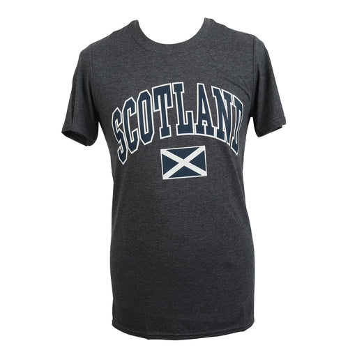 ScotshirtsModel: A04055_DARK HEATHER 100% cotton Size Range XS to XXL Plain with Scotland and Saltire print Standard T-Shirt Best way to show off your Scotti...