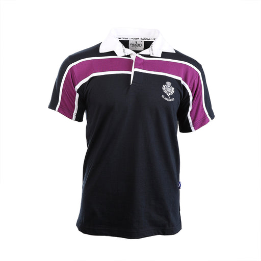 Model: A00023_NAVY 100% Cotton Size Range XS to 4XL Plain with Purple Stripe and Thistle logo Rugby Shirt This new rugby navy colour, short sleeve ...