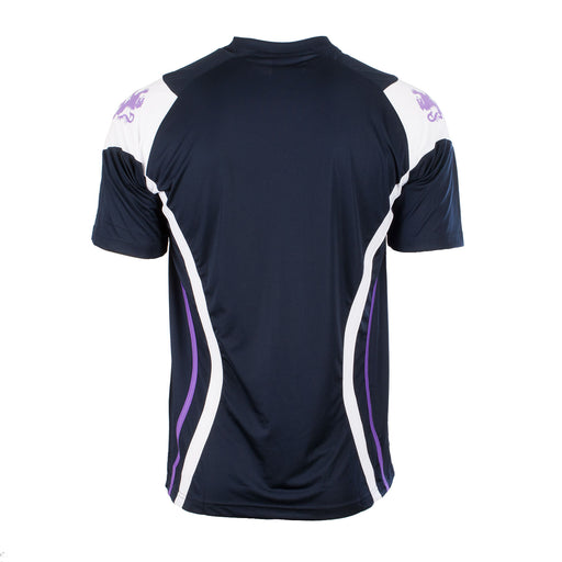 Model: A00008_NAVY 100% Cotton Size Range XS to 4XL Plain with Purple Stripe and Thislte embroidery Rugby Shirt This new rugby navy color shirt has...