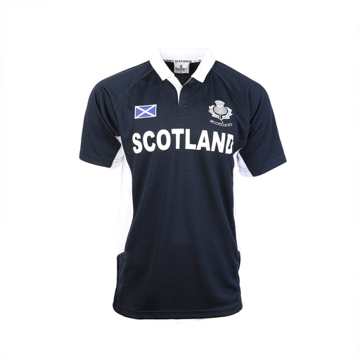 Model: A01353_NAVY/WHITE 100% Polyester Size Range XS to XXL Plain with Thistle and 6 Nations logo Rugby Shirt Show your support for the Scottish t...