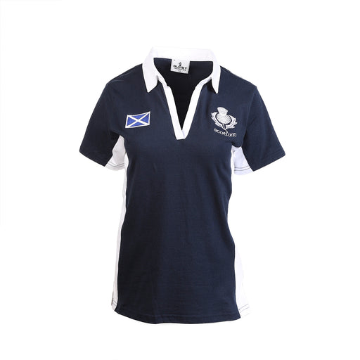 Model: A07996_NAVY 100% cotton Size Range XS to L Saltire & Thistle embroidered Rugby top Ladies Short Sleeve Rugby top with a Saltire and This...